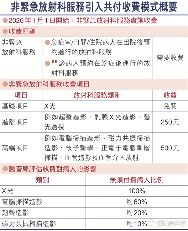 医管局因应资源,会优先为紧急及危重病人提供即时服务,而非紧急放射科服务引入共付收费模式后,基础的X光服务仍然免费,其他进阶服务项目如超声造影等则要收取250元费用,而高端项目包括电脑扫描造影及磁力共振扫描造影等,则要收取500元。局方评估,仍有六成病人接受电脑扫描造影时无须额外缴付费用,而接受磁力共振扫描造影的病人则有一成无须额外缴费。