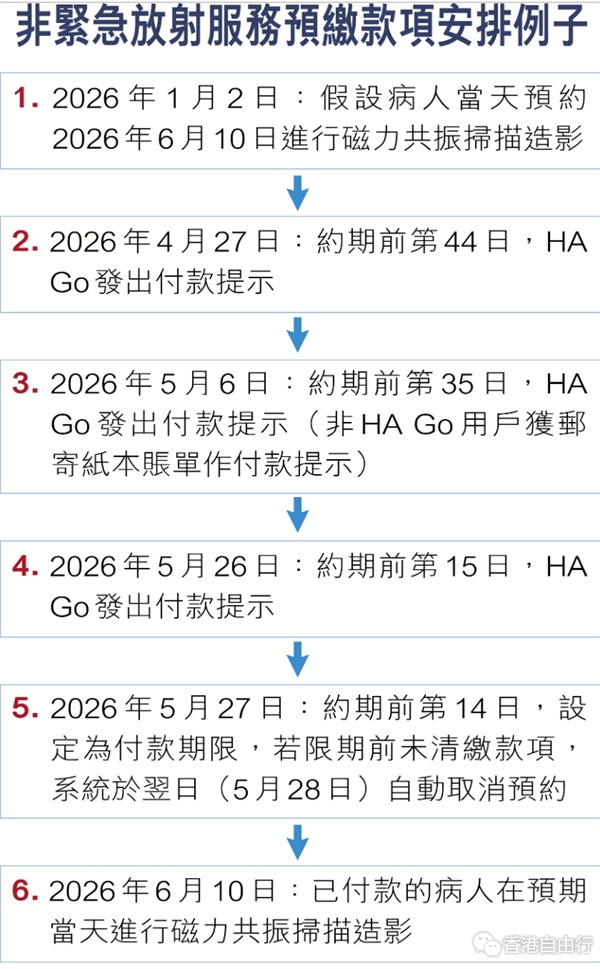 病人在预约接受放射科服务后,须于预约日期前最少14天完成付款,HA Go手机程式将在付款限期前发出最多三次付款提示,倘病人未于付款限期前清缴款项,系统将于翌日自动取消预约,放射科部门会将预约时段分配给其他病人。若需要重新预约,则先由相关医生根据临床情况评估是否需要重新转介申请放射科服务,放射科部门会进行新的预约排期。