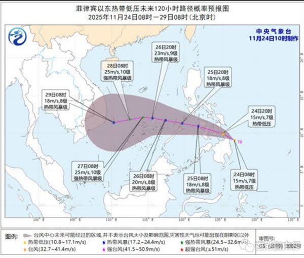 预计,该低压将以每小时15~20公里的速度向西偏北方向移动,可能于未来24小时内加强为今年第27号颱风,并于25日夜间进入南海南部海域,强度缓慢加强,最强可达强热带风暴级(25~28米/秒,10级)。