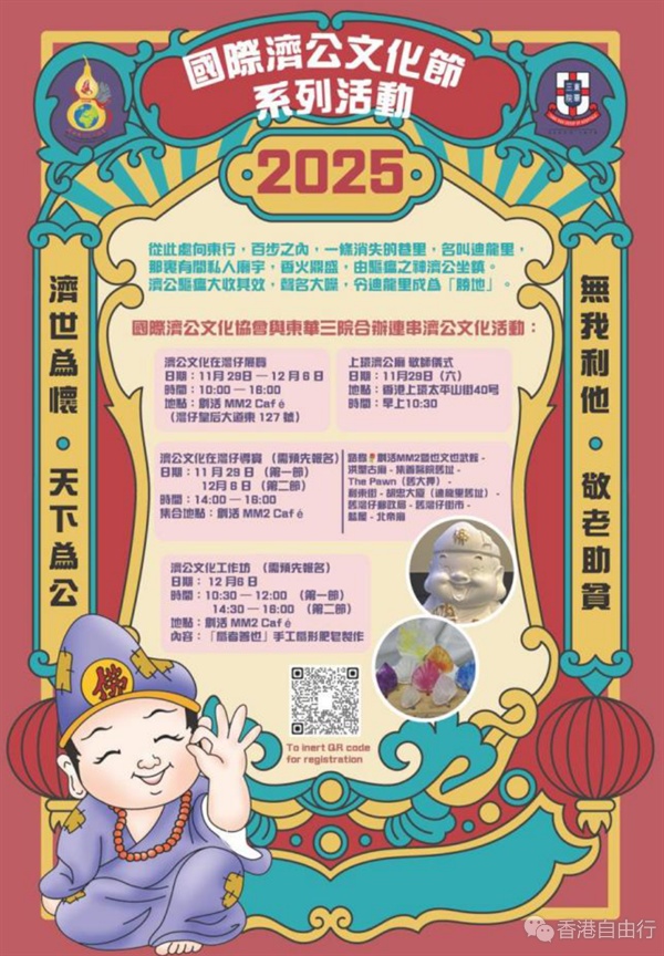香港最早出现的济公庙位于湾仔皇后大道东迪龙里的一条窄胡同,因济公驱瘟有功,庙宇经常香火鼎盛,更有「胜地」之称。随着市区重建,该窄巷现时已遭拆卸,社区回忆亦已被淡忘。由国际济公文化协会及东华三院合办的「2025国际济公文化节」特意移师湾仔,11月29日起一连七日,在距离以前胜地咫尺的一间庙宇餐厅,举办一连串「济公文化在湾仔」导赏展览活动,带领公众人士重拾济公昔日在湾仔的足迹。