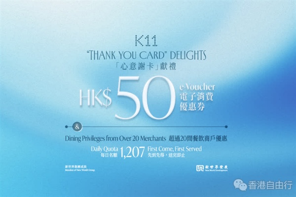今次集团推出的消费礼遇为期一个月,由今年12月7日投票日起至明年1月8日,市民只要手持「心意谢卡」,即可在K11 MUSEA 或 K11 Art Mall 的地下礼宾部,换领价值港币50元的电子消费优惠券,并于今年12月7日至明年1月22日,可在场内超过300间指定商户使用,凡单一消费淨值满港币100元或以上即可享港币50元折扣优惠,亦可享超过20间餐饮商户的额外优惠。