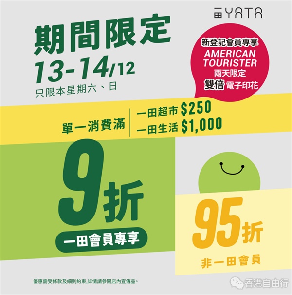 另外,全线一田亦于今个周末(12月13及14日)推出一连两日限时激减优惠,生活百货及超市同步激减,多项满额折扣优惠同步发放。一田会员于一田生活百货单一发票消费淨值满$1,000、于一田超市单一发票消费淨值满$250,或于每日一田单一发票消费淨值满$200,均可享9折优惠。