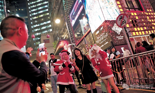 平安夜,中环皇后像广场灯光表演「光影汇」每半小时举行一场,以3D投影于八幢中环地标外牆呈现多种图案,入夜后的人流愈来愈多,一度有逾百人排队打卡。附近的兰桂坊也换上圣诞新装,到处是圣诞灯饰及主题装置,现场水洩不通,警方在长斜路围起铁马,实施人潮管制。