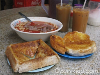 难得的大排档风情,铺子够破旧,人气够旺盛!站在一边等了一会儿才有一个搭台的机会。点了番茄牛肉面,之前看介绍说味道如何如何之好,实际吃下来,觉得一般,番茄太多使得味道有些偏酸,广东的面也没有劲道。还点了一个烤的很脆的面包,上面有蜜酱,非常好吃。顺便说一下,因为是搭台,两拨人点的菜有重复,服务大妈上菜时,也不说是给那一拨客人的,放在我和另一拨客人中间,结果都很疑惑不敢动筷子。