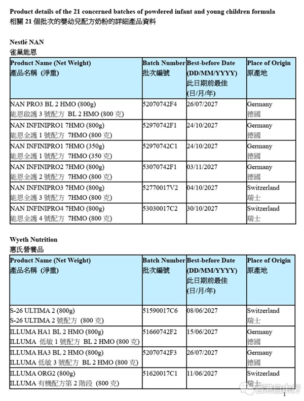 食物环境衞生署食物安全中心(中心)今日(6日)表示,早前透过食物事故监测系统,得悉雀巢公司在欧洲自愿回收部分批次的雀巢婴儿配方奶粉,因怀疑个别产品可能受到蜡样芽孢杆菌污染。中心经联络本地进口商包括雀巢香港有限公司(雀巢香港)、零售商及有关当局,根据雀巢香港今日的最新资料,其进口本港的婴幼儿配方奶粉有21个批次亦可能曾使用相关受到污染的原材料,为审慎起见,雀巢香港已自愿将受影响产品停售和下架,并展开预防性的回收。
