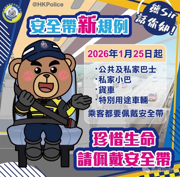 香港特区政府运输署提醒大家,由1月25日起,乘搭公共交通工具同商用车时,「如有安全带,坐低就要戴」,以保障出行安全。