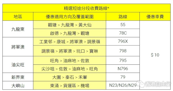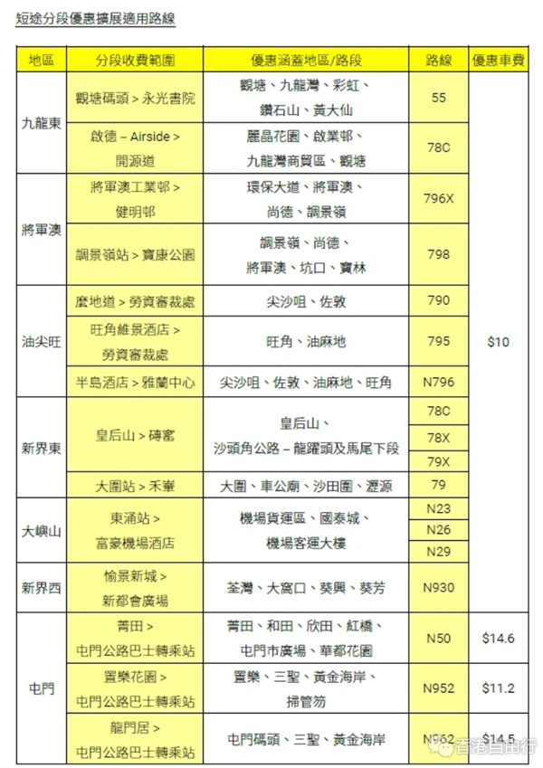城巴此次扩展短途分段收费计划,适用于近20条新发展区路线、热门路线及通宵路线,提升油尖旺、九龙东、将军澳、新界东及大屿山等地的交通便利性。乘客于大部分适用路线上,实际可享受的分段收费优惠车费低至10元,部分路线更能节省高达20元。