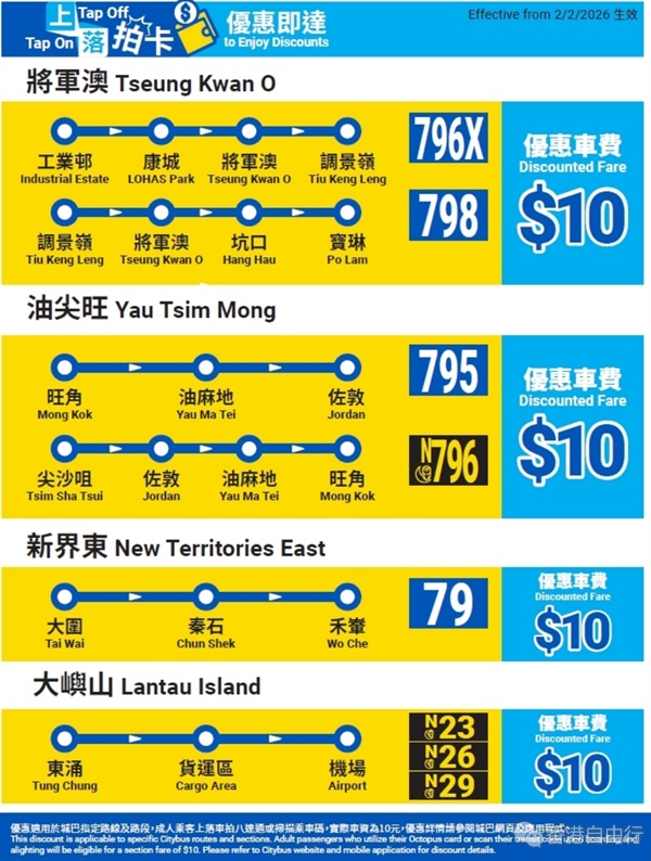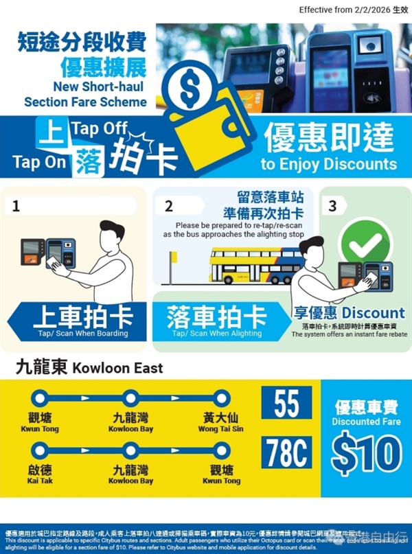 城巴将于2月2日(星期一)起,为油尖旺、九龙东、将军澳、新界东及大屿山等多条路线推出全新的「上落拍卡 优惠即达」短途分段收费安排,包括55、78C、796X、798、795、79、N796等,进一步扩大受惠客群,鼓励市民善用公共交通出行。乘客只需支付低至10元的优惠车费,即可在日间及通宵时段于区内穿梭。