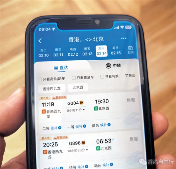 旅客蔡小姐与家人计划2月14日从香港前往北京,但她发现13日至15日连续三天的高铁票均已售完。她坦言,「随着港人节假日北上出行消费热持续,前往部分热门城市的高铁票预订热潮堪比内地春运高峰,今年春节前的香港高铁出行更加火热。还好我们随即『转战』购买深圳车站始发班次,仍有个别班次尚有馀票。」