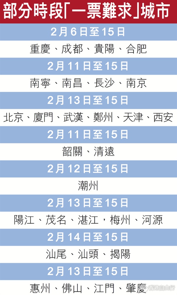 香港文汇报记者2月1日在中国铁路12306平台查询发现,部分长途直达城市在2月12日之前的车票同样异常紧俏。其中,香港高铁在2月6日至12日往重庆、成都、贵阳、合肥的车票已被预订一空,2月11日至12日前往长沙、南宁、南京、南昌的车票也基本告罄;2月7日至12日前往昆明、武汉、郑州的车票亦被抢购,仅剩个别班次有少量馀票。