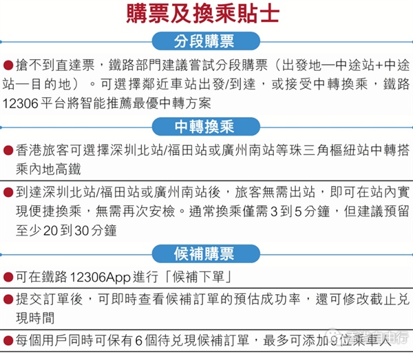 铁路部门人士建议,春运期间,香港旅客搭乘高铁部分线路可「绕道」深圳或广州等珠三角车站始发,由于这些车站始发班次相对较多,部分时段仍可望「捡漏」购得馀票。国铁集团指出,春运期间将在客流集中方向及时安排加开旅客列车或夜间高铁,最大限度增加运力供给,所有新增票额将优先配售给已提交候补购票订单的旅客。