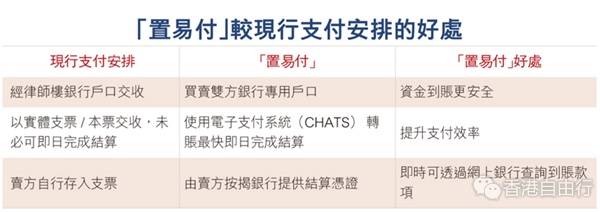 金管局副总裁阮国恒昨在记者会上表示,自2026年2月28日起,所有提供住宅楼宇按揭服务的持牌银行都会将PAPT拓展至二手住宅物业买卖,同时将新安排正式命名为「置易付」,让市民更易认识新支付安排。在新安排下,买方的按揭贷款款项会透过银行之间的电子支付系统转账至卖方银行,卖方最快可于成交当日收到出售物业的收益。相较于传统支付方式,款项须经双方律师的银行户口以支票进行交收,一般需待成交后两个工作天及支票收妥后方可完成收款,「置易付」是更快、更直接、更安全的选择,同时可减低银行业进行按揭业务时所面对的信用和操作风险。如有意採用「置易付」,买卖双方可通知其地产代理在临时买卖合约加入相关条款。