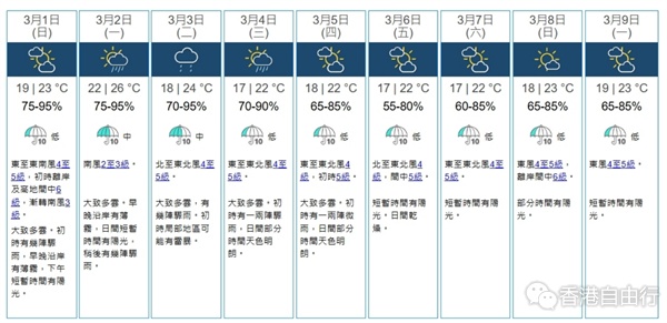 天文台今日(28日)表示,现时影响广东沿岸的偏东气流会在未来一两日被一股潮湿的偏南气流取代,该区早晚有薄雾,日间温暖。预料一道冷锋会在下周一(3月2日)晚上至下周二(3月3日)初时横过华南沿岸,该区会有骤雨。