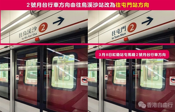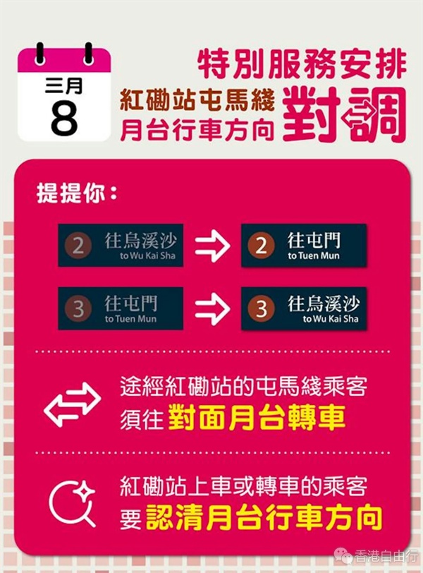 港铁指,为配合屯马綫红磡站至尖东站之间的路轨改道跟进工序,将于本周日(3月8日)按计划实施第二次特别服务安排。当日途经红磡站的乘客,需下车并到对面月台转车继续行程;另外在红磡站登车乘搭屯马綫的乘客,届时需留意月台行车方向会与平日对调,即屯马綫2号及3号月台的列车行驶方向将与平日对调,2号月台列车将改为往屯门站方向,3号月台列车则改往乌溪沙站方向。港铁提醒乘客当日应预留充裕时间,以应付可能稍为延长的行程。