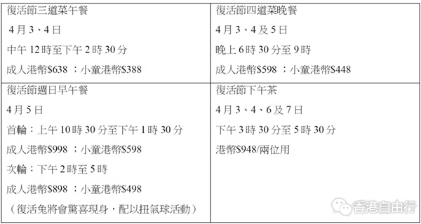 复活节早午餐将带来丰盛的美食体验,更有复活节兔子惊喜现身。宾客可细味丰富的海鲜盛宴、即席烹调美食,以及主菜选择如羊肩肉卷,并享用主题节日甜品吧。此外,复活节下午茶为您于穿梭市集与工作坊之间提供完美的歇息时刻。