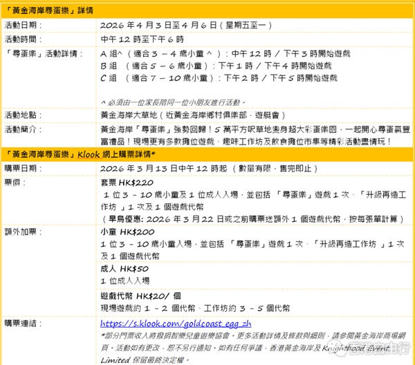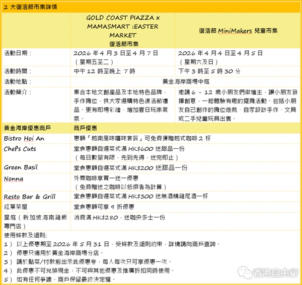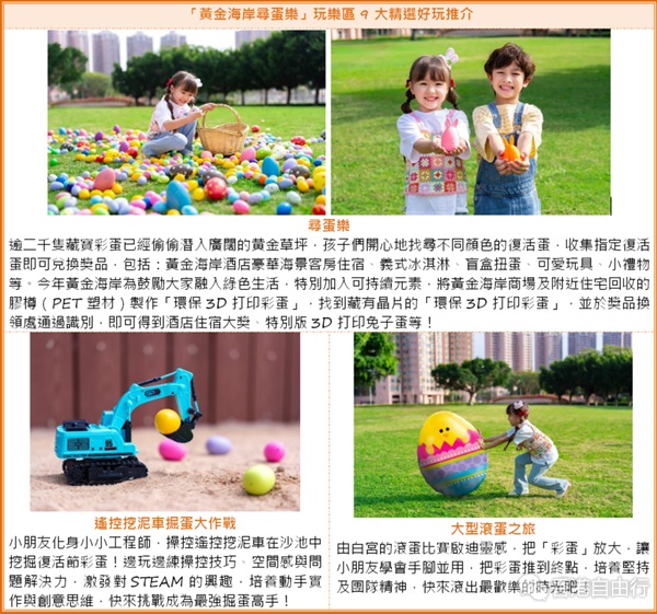 黄金海岸于4月3日至6日举办「黄金海岸寻蛋乐」,孩子们可于超过5万平方呎草坪上尽情玩乐,小朋友至爱的寻蛋游戏「寻蛋乐」今年强势回归,更带来9大游戏体验,玩累了不妨到「复活美食市集」品尝本地製作复活节美味,入场的参加者将获赠活动小册子,内含商场多项餐饮优惠券,送越式咖啡、无酒精鸡尾酒、甜品等,让大家玩乐后能即享美食充电。