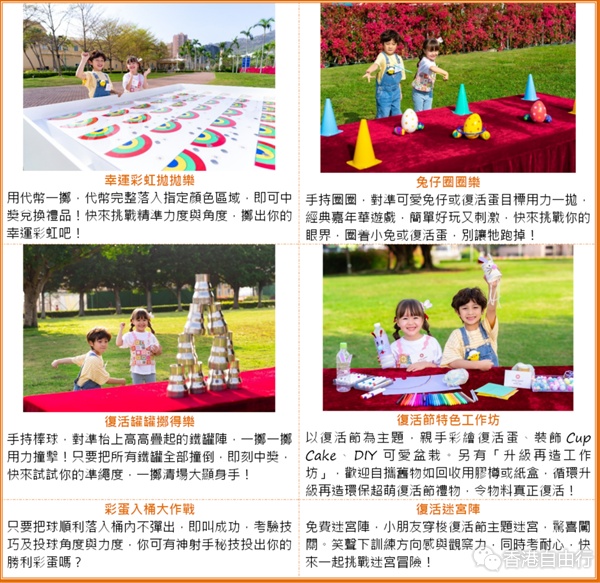 走在黄金海岸广阔的5万呎户外草地上,无论是爸爸妈妈还是小朋友,都能感受到大自然的自由与无拘无束,可以尽情玩乐、释放活力!今年小朋友至爱的寻蛋游戏「寻蛋乐」强势回归,收集特定彩蛋换奖品,今年特别加入可持续元素:寻获「环保3D打印彩蛋」即可得到大奖!「遥控挖泥车掘蛋大作战」边玩边体现STEAM多个核心概念;「大型滚蛋之旅」极考验手脚协调,与巨蛋并肩作战衝向终点;走入「复活迷宫阵」跟爸妈及小朋友你追我逐,放电好时机;再来挑战掷彩虹、抛圈圈等嘉年华必玩游戏,一同大显身手赢奖品!爱手作的小朋友还可以到「复活节特色工作坊」,製作可爱满分的复活节礼物。