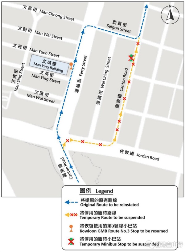 所有车辆将禁止由广东道(北行)转入西贡街,以及由西贡街(西行)前行至上述一段西贡街;沿西贡街(西行)或广东道(北行)前往渡船街或伟晴街的车辆,须返回原有路线,即沿广东道(北行)左转至甘肃街(西行);及九龙专线小巴第3号线将恢复原有小巴站,营办商会张贴告示通知乘客。