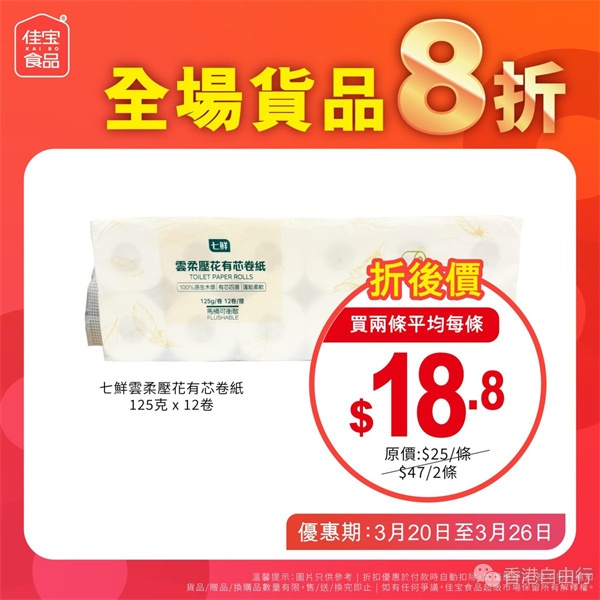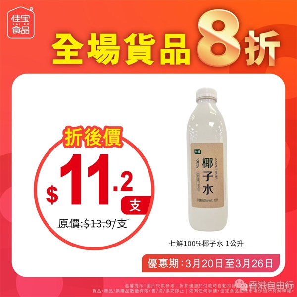 多款减价货品包括佳乐牌茉莉香米8公斤$64元/包、七鲜100%椰子水1公升$11.2/支、七鲜云柔压花有芯卷纸125克x12卷$18.8/条、七鲜德氏小麦啤酒618毫升x6罐$36/箱等。