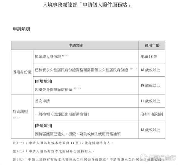 持有11至17岁人士身份证并年满18岁而需换领成人身份证人士的申请;以及