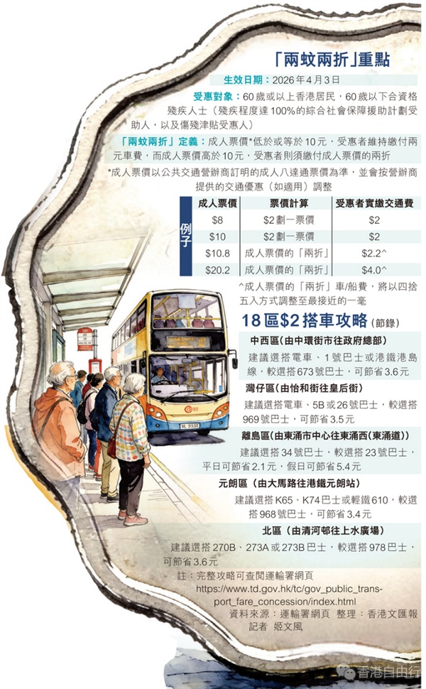 另外,运输署网页亦更新了「两蚊两折」的详情,强调2元优惠计划的受惠对象维持不变,合资格受惠者可使用乐悠咭或「残疾人士身份」个人八达通继续享受乘车优惠。网页并上载了「两蚊两折」实施之后的18区「两蚊」搭车攻略,举例如受惠者从中环街市乘车去政府总部,建议选择电车、1号巴士或港铁港岛线,可维持2元车费,但如乘搭673号巴士则会多花3.6元。