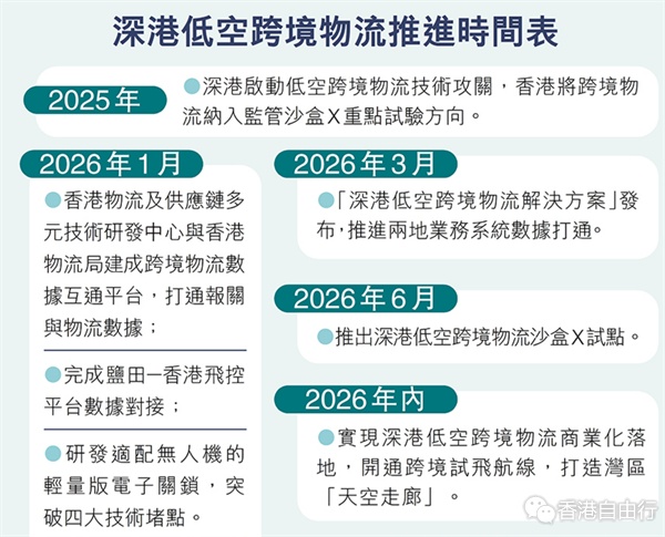 具体而言,沙盒试点将实现三大突破:一是两地飞行计划双向互认,香港申报的飞行计划可实时同步至深圳监管平台,反之亦然;二是依託通导监基础设施对跨境飞行轨迹全程跟踪监管,构建空地一体安全防线;三是整合轻量电子关锁、飞控数据互通、海关监管系统,形成「申报—飞行—通关—送达」全流程闭环。陈磊鑫表示,低空跨境物流并非技术上「飞不起来」,而是缺少安全监管体系、标准规范与基础设施保障,盐田山海地形、气象环境、建筑分布对无人机飞行干扰显著,必须通过严格测试评估与系统验证,才能构建政府放心、企业安心、安全可控的飞行环境。