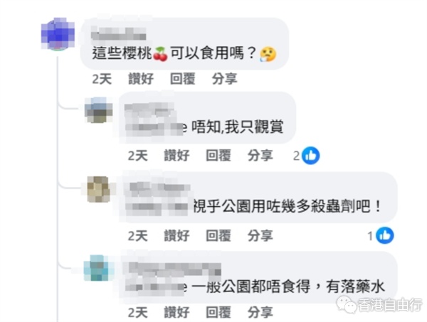 然而,最令一众网民好奇的,莫过于「这些樱桃可不可以食用?」对此,楼主回应称「唔知,我只观赏」,亦有其他网民提醒:「一般公园嘅果实都唔食得,有落药水」、「呢个係苦樱桃,不可以食用。」呼吁市民眼看手勿动,切勿採摘。
