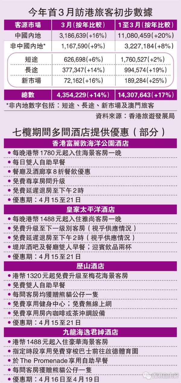 香港盛事连连,旅游业的发展势头持续向好。香港旅游发展局昨日公布,3月份访港旅客有435万人次,按年升14%,首季累计1431万人次,按年增17%。旅发局表示,3月份国际旅客佔比较之前高,相信与当月举办多项国际级艺文盛事带动有关。