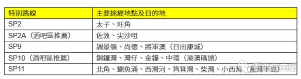 特别路线包括:SP2(往太子、旺角)、SP2A(佐敦、尖沙咀)、SP9(调景岭、尚德、将军澳、日出康城)、SP10(铜锣湾、湾仔、金钟、中环、港澳码头)、SP11(北角、鰂鱼涌、西湾河、筲箕湾、柴湾、小西湾、蓝湾半岛)。