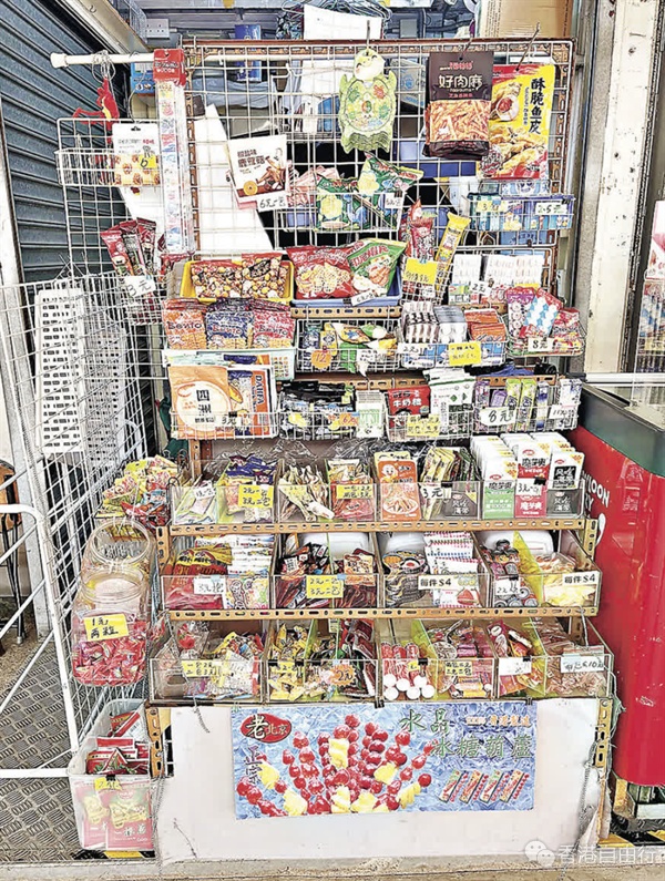 拍完照后,沿楼梯下来就到南山商场的平台,这里只有零星几间舖营业,白底红字的手写招牌,看起来颇有历史。商场内没有空调,只有几台风扇,还未到夏天,已经能感受到闷热。不过走到平台外围,就有一家售卖雪糕的「C+屋」,悭妹迫不及待买一个雪糕消暑。菜单颇为震撼,一眼望过去竟然有32款不同口味的雪糕球可选,当中更有「南山豆腐」、「芝麻街」、「石板街」、「啤梨」这些闻所未闻的口味。一颗紫心香芋味单球8元,配上4元的特大珍宝甜筒,大件夹抵食。旁边还放有一个怀旧零食架,低至1元就有得食,真是穿越回童年。