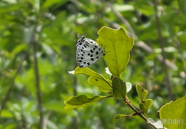 近日有生态爱好者于凤园蝴蝶保育区拍摄到稀有物种豹斑双尾灰蝶。环保协进会顾问委员潘瑞辉表示,豹斑双尾灰蝶的幼虫以广寄生为寄主植物,该蝶种自2021年后未曾于凤园出现,在渔护署的评级中,此蝶属罕见蝴蝶物种。其翅底布满许多黑色斑点,排列形似豹纹,是辨识此蝶的重要特徵之一;后翅外缘带有明显的「尾突」,令飞行姿态格外独特。