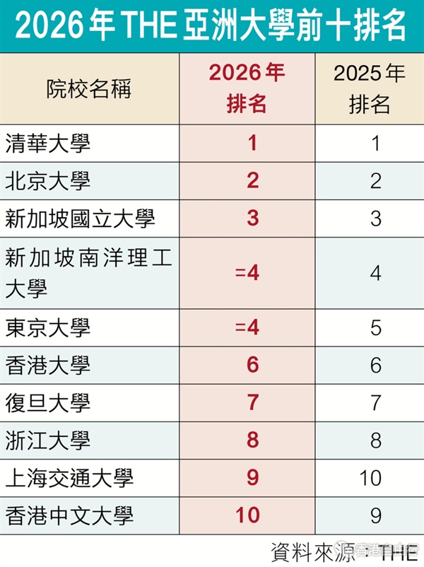 2026 THE亚洲大学排名共有36个国家及地区共929所高校上榜,较去年明显增加。在高教竞争愈发激烈的趋势下,今年亚洲前十大学整体格局维持不变,包括内地佔5所,新加坡及香港各佔两所,馀下一所来自日本,只是名次略有调整。其中清华大学、北京大学续居首二位;新加坡国立大学紧随其后位列第三;而东京大学则较去年上升一位,与新加坡南洋理工大学并列第四。其馀第六至八位与去年一样依次为港大、复旦大学及浙江大学,第九及第十的上海交通大学及港中大名次则与去年对调。