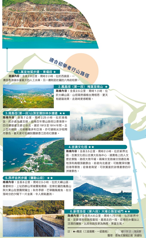 对于行山初学者,周国强推荐香港四大经典长途远足径,分别为麦理浩径、卫奕信径、凤凰径及港岛径,这些路径横跨香港不同区域,涵盖山岭、水塘、海岸、丛林等多样地貌,而且每条路径均设有分段,难易程度各有不同,初学者可以拣选当中的短途或低难度段落起步,亦建议旅客可先从官方网站或「郊野乐行」应用程式了解详细路线资料,循序渐进。