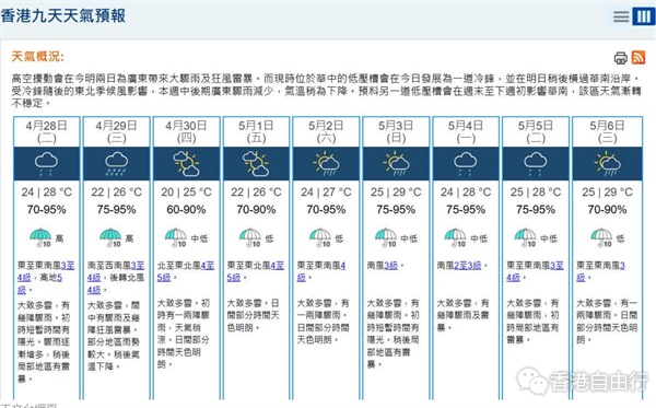 香港天文台今日(28日)表示,受高空扰动影响,明日(29日)本港大致多云,间中有骤雨及几阵狂风雷暴,部分地区雨势较大。同时,预料一道冷锋会在明日稍后横过华南沿岸,本港气温会逐步下降至星期四(30日)早上最低约20度。市民请留意天气变化。