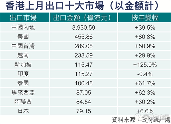 从出口目的地看,温嘉炜指出,期内香港输往内地的出口,按年增长加速至近四成;输往美国的出口增长更显著增长至八成,这是逾42年来的最大升幅。输往新加坡的出口按年增长大幅加快55.2个百分点至1.25倍,更是1973年有纪录以来的最大增长;输往越南、中国台湾地区及泰国的出口增速亦显著加快。就主要出口商品而言,电动机械相关产品出口录得47.9%按年升幅,为2021年1月以来最高;通讯相关设备及仪器出口录得超过九成按年升幅,为1994年有纪录以来最快增速。