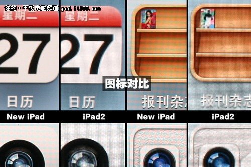 通过桌面图标的微距对比,能很明显的看出iPad3屏幕的细腻,图标经过了高分辨率重绘后,锯齿边、网点完全看不到了。
