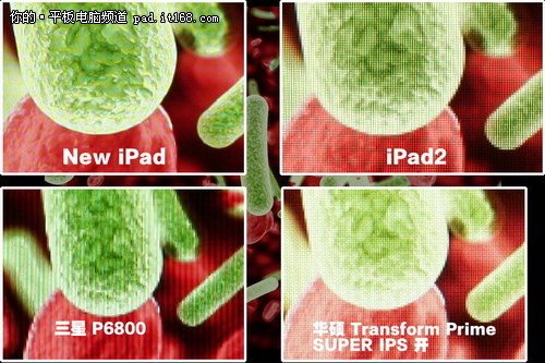 经过微距拍摄对比,我们发现iPad3的显示效果相当的细腻,颜色自然逼真,达到了当前液晶显示效果的巅峰水准。单品图比较难以体现出差异,我们将其与当前几款主流高端平板:三星P6800、华硕Transformer Prime以及iPad2的显示效果进行对比。