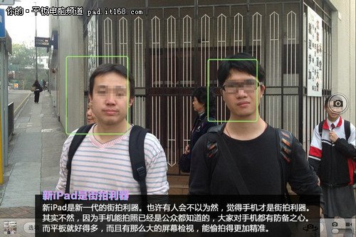 因为与iPhone4采用同一摄像头组件iSight,因此iPad3也具备500万像素拍摄能力及1080P影片录制能力,拍照效果不俗。如果说iPad2的拍照能力是小学生,那么iPad3一跃就到大学了。通过样张对比,我们能感觉到iPad3已经可以干掉部分低端卡片机了。另一个值得注意的进步是,iPad3支持人脸捕捉,可以自动对人脸对焦,实际使用中感觉捕捉非常灵敏,比较好用。