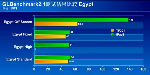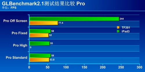 虽然硬件跑分并不能代表真实的使用体验,但为了能进行一次跨平台的量化比较,我们还是针对影响用户体验的关键性硬件(GPU)进行了跑分测试。测试软件使用GLBENCHMARK2.1 。参与对比的是安卓平台的四核平板——华硕Tansformer Prime(TF201)。