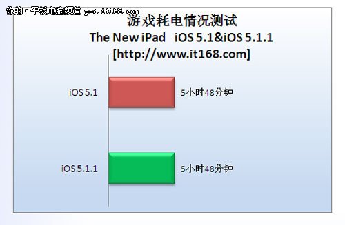 由上图可见,iPad3的续航能力和iPad2并无太大差别,各位大可不必担心了。从图上我们能看出来,玩游戏是最耗电的行为,而由于A5X内核针对视频解码有额外的设计,因此视频播放反而成为支撑时间最长的应用了。