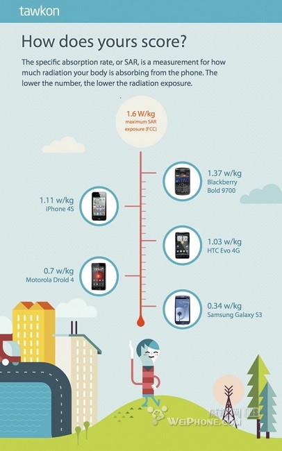 当然了,比iPhone 4S辐射更严重的还是黑莓Blod 9700,这款手机的SAR指标达到1.37w/kg。而图中的HTC Evo 4G、摩托罗拉Droid 4、以及仅有0.34w/kg的三星Galaxy S III均排iPhone 4S之后。