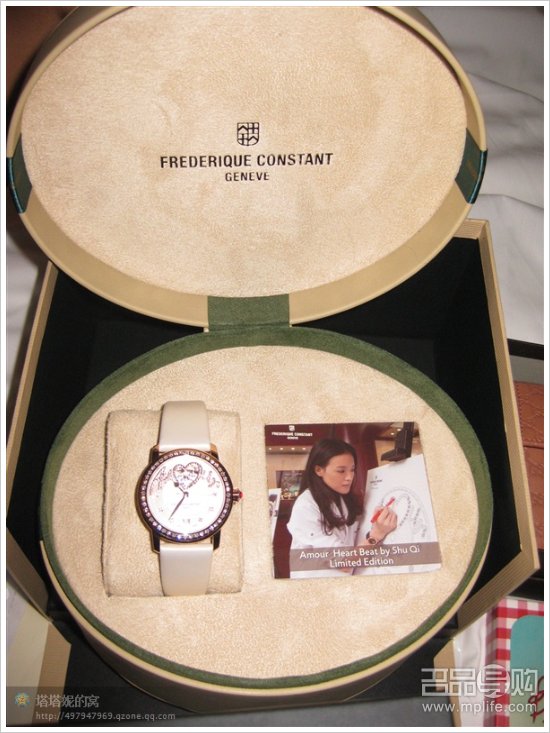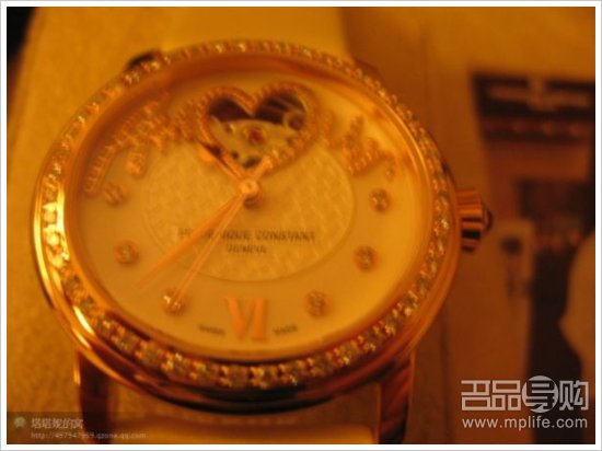 这款表是舒淇为康斯顿家独家设计的,机械表芯,全球限量888块,这块是第798块.内镶88颗钻石,里面是法语爱情的意思,BA教我们念"阿~~摩"我一直拍出来都是花的.还送了一款大的丝巾,很漂亮,不过这表也花了30000多港币,折差不多27000多人民币,贵死了,晕~~~不参加折扣活动.