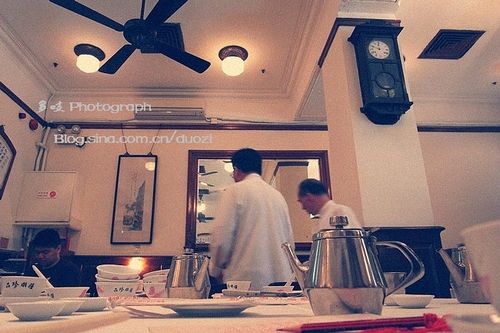 环顾四周,卡座里的大多是打扮儒雅带着点儿英伦范儿的上了年纪的人,据说这里的座位每天都是有固定客人的。清一色的男伙计也都是在五十开外的年纪,身着白色短褂,玄色长裤,神情里一丝若有似无的高傲。