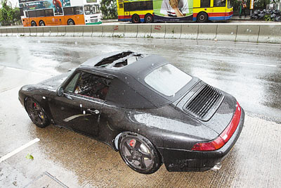 焚毁的灰黑色跑车为保时捷 911 Carrear Cab,已有18年车龄。Simon Birch表示,该车是他2010年前以50万港币买入的二手车。