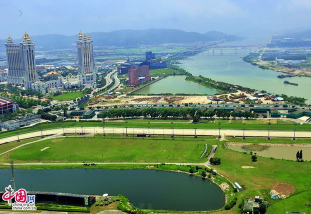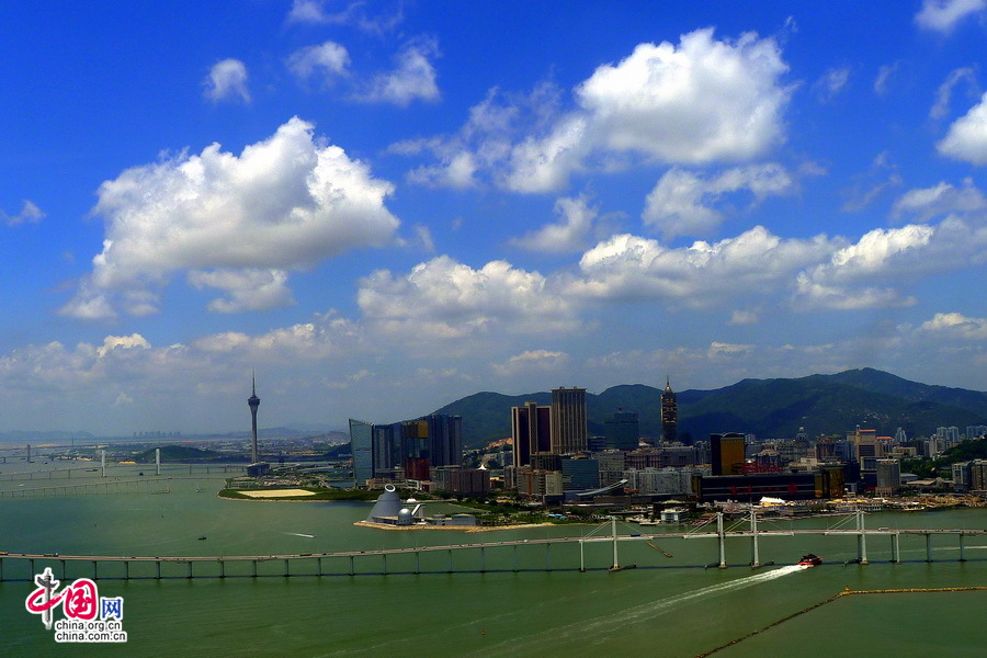 在澳门【星河湾•名门世家】远眺澳门风光无限,尽览澳门半岛、赛马场、 “金光大道”、小潭山及横琴十字门商务社区等五重景观有前所未见的感觉。 王京广 摄