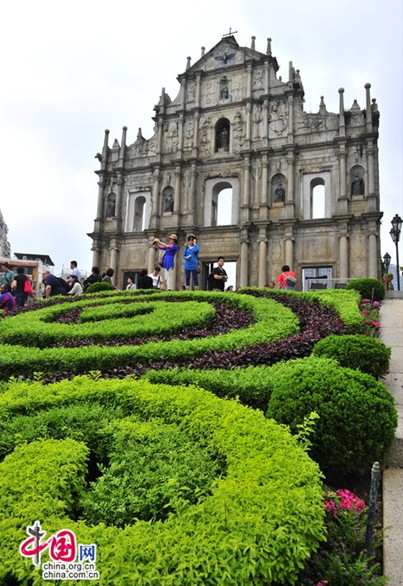大三巴教堂牌坊。澳门博物馆坐落于大炮台上,当年葡萄牙人最早的落脚点就在那里是城市的心脏。俯瞰内港的大炮台山被耶稣会士选中,他们在那里建立了炮台、神学院及教堂,俗称“大三巴”。1835年的一场台风失火毁了神学院以及大炮台的大部分建筑和教堂,只有教堂的前壁(俗称牌坊)得以幸免。 王京广 摄