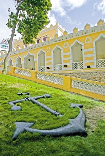 离开了主教山小堂,沿西望洋斜巷慢步走,到了学校巷口,右转为港务局大楼, 为澳门唯一的阿拉伯式建筑物,是昔日的港务局和水警稽查队的办公地点。