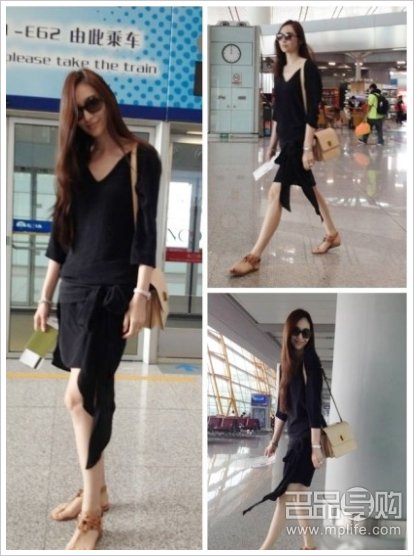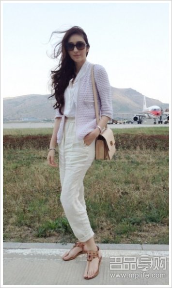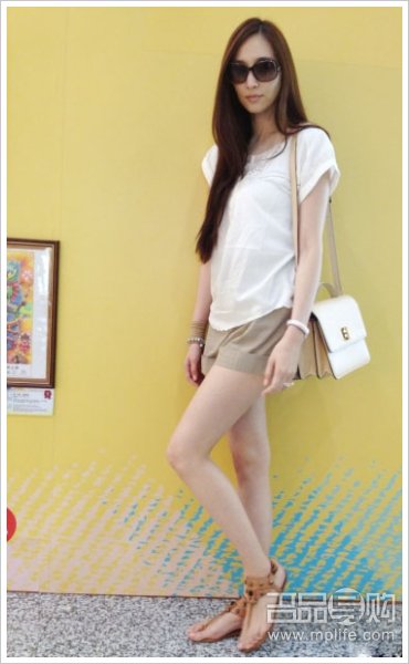 吴佩慈的全身淡色调的搭配,是十分适合夏季的装扮。翻盖包包在这里的搭配效果十分出色,让人感觉尤其清爽。
