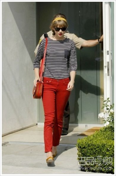 看来泰勒最为得心应手的就是将这款红色复古包搭配海军纹,气场强大