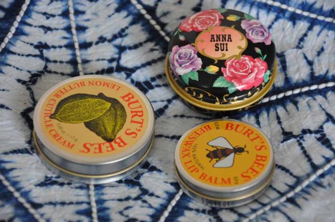 看到小铁盒子就走不动路了,超级可爱呀。BURT'S BEES的柠檬护甲霜比较好用,清香的柠檬味儿也好闻。但是润唇膏不喜欢,一股子绿箭口香糖的味道,而且不够润。ANNA SUI的润唇膏大爱呀,他家传统的那股香味儿,淡淡的很好闻,擦上油乎乎很润,但是又不会觉得浮在嘴上润不进去的感觉。非常棒!